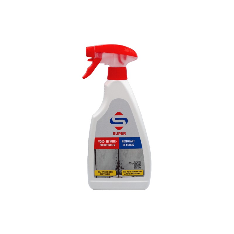 SUPER Voeg & Weerplekreiniger bevat actief chloor in een gebruiksvriendelijke spray. Vloeibaar, sterk alkalisch reinigingsmiddel met actief chloor. Hygiënisch reinigen van harde oppervlakken in o.a. sanitaire ruimtes. De ruimte hoeft niet droog te zijn, het product functioneert ook uitstekend in een vochtige omgeving. Sterk in het verwijderen van organische vervuilingen zoals: vetten, eiwitten ed.